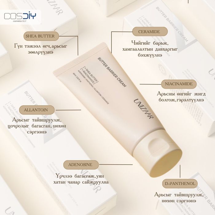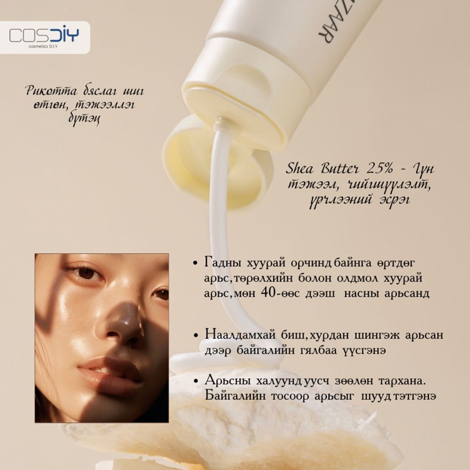 ✨ ОНЦЛОГ• Shea Butter – Гүн тэжээл• Ceramide – Чийг түгжих хамгаалалт• Niacinamide – Өнгө сэргээх• Adenosine – Үрчлээний эсрэг💫 Хуурай, эмзэг, насжилттай арьсанд төгс тохирно