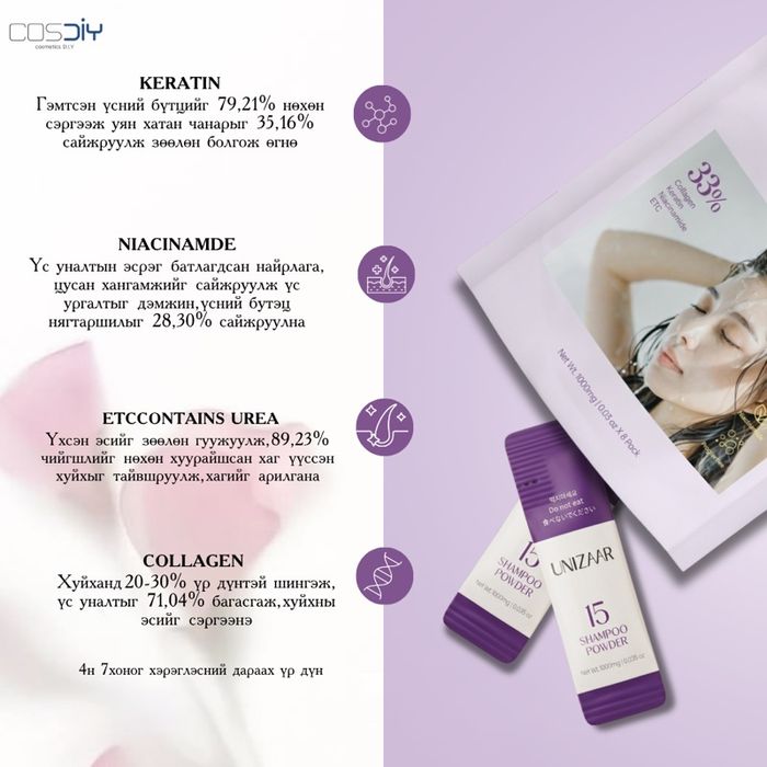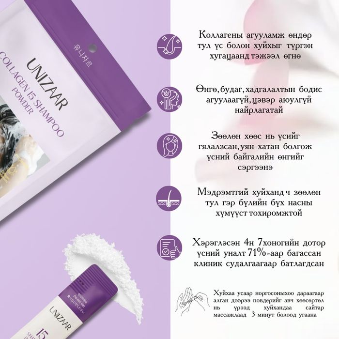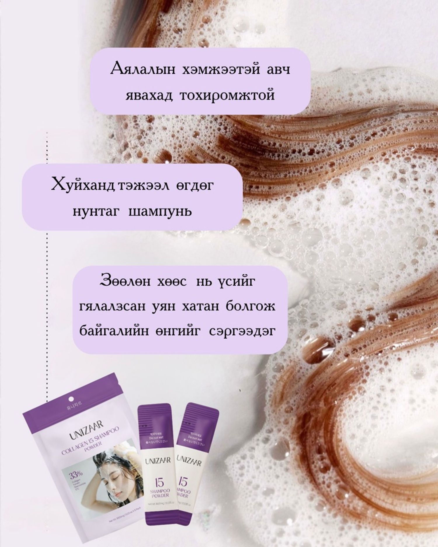 Шингэн шампуниас ялгаатай нунтаг хэлбэрийн коллагентай, кератинтай шампунь нь үс болон хуйханд шаардлагатай тэжээлийг илүү гүн шингээж, илүү шууд үр дүн үзүүлдэг.
