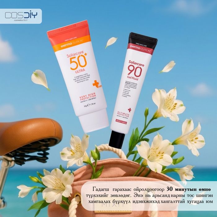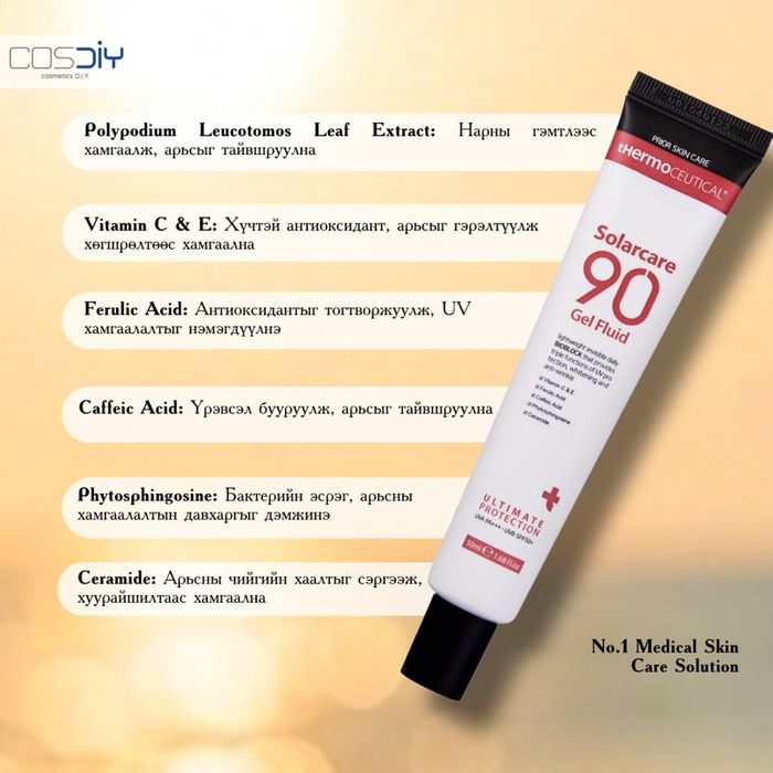 Solarcare 90 Gel Fluid Chemical Sunscreen ( 50ml ) Нарны тос Хөнгөн, гелэн бүтэцтэй — маш амархан шингэнэ • Арьсанд үл харагдах, будалтын доор төгс сууна • UV хамгаалалт + арьс цайруулах + үрчлээний эсрэг 3 үйлдэл • Тослог, холимог, будалт хийдэг хүмүүст илүү тохиромжтой • Өдөржин тав тухтай, наалдамхай мэдрэмжгүй Makeup-тай явдаг, хөнгөн мэдрэмж хүсдэг хүмүүст
