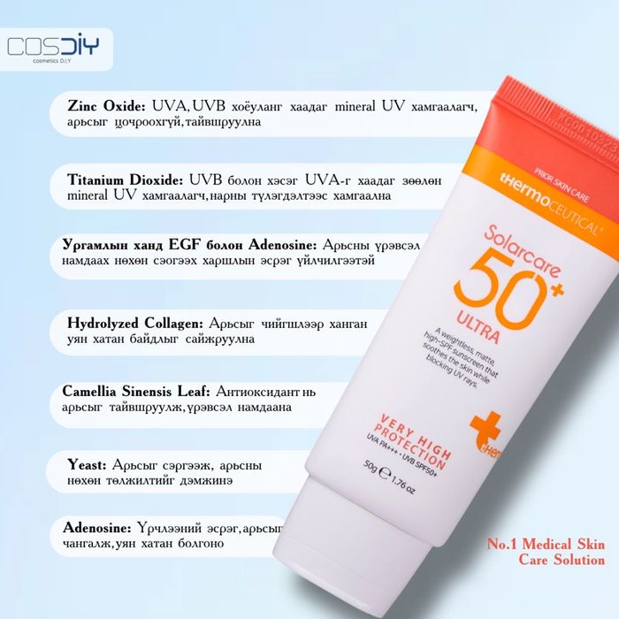 Solarcare 50+ Ultra Physical Sunscreen ( 50g ) Нарны тос Матт бүтэцтэй — арьсыг тайвшруулна • Гадаргуу дээр хамгаалалтын бүрхүүл үүсгэж UV-г ойлгон хамгаална • Эмзэг, мэдрэмтгий арьсанд маш тохиромжтой • Арьс эмчилгээний дараа ч хэрэглэж болно • 12+ наснаас хэрэглэж болно Эмзэг, батгатай, арьсаа тайвшруулах хэрэгтэй хүмүүст best